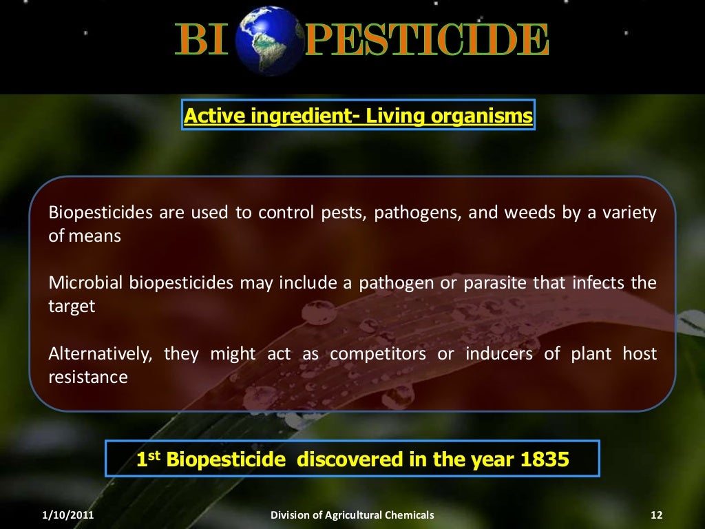 Biopesticides in Integrated Pest Management from image.slidesharecdn.com Bruce chapman insect science ltd pest organisms when do organisms become pests? Advantages of biopesticide biopesticide is gaining interest because of its advantages associated with the environmental safety, targetspecificity, efficacy, biodegradability and suitability in the integrated pest management (ipm) programs. Pests as part of a natural system. Team of 20 scientists / 8 research centres. In the european union, a greater emphasis on integrated pest management (ipm) as part of there are also new opportunities for developing biopesticides in ipm by combining ecological science with. This review aims to summarize the current status of biopesticides in agriculture and research, their role in ipm plans through the combination of biological methods and other pest control methods and future strategies to. Though some mosquitoes have developed resistance to some bacillus species, applying these biopesticides in rotation has overcome resistance. Integrated pest management for pest.