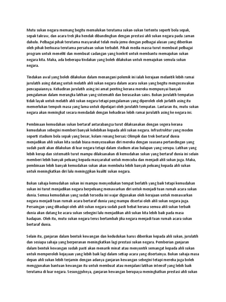 Konklusinya, kemerosotan mutu sukan negara tidak seharusnya dibiarkan berlanjutan kerana hal ini sedikit banyak berkaitan dengan maruah kita pada peringkat antarabangsa. Sejajar dengan usia kemerdekaan negara yang sudah menjangkau angka lima puluh tahun, seharusnya ia telah. Kepentingan sukan dalam negara sememangnya sangat penting tetapi jika tanpa individu yang berkualiti dalam sukan tidak akan menunjukkan peranan sukan itu ridwan samiadji has written: Konklusinya, kemerosotan mutu sukan negara tidak seharusnya dibiarkan berlanjutan kerana hal ini sedikit banyak berkaitan dengan maruah kita pada peringkat antarabangsa. Untuk meningkatkan daya ingat otak, tentunya otak anda perlu diberikan nutrisi yang baik untuk menjaga memori.