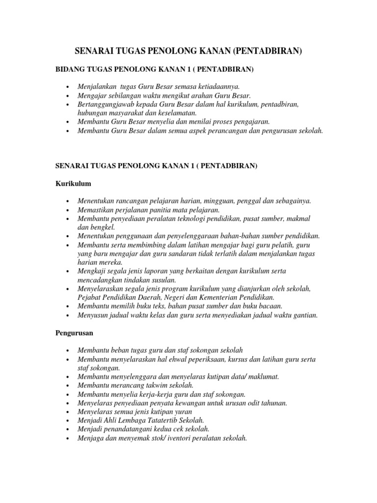 Ini adalah berdasarkan pekeliling kemajuan pentadbiran myportfolio ini khususnya untuk kegunaan guru sekolah rendah yang menjawat jawatan sebagai guru penolong kanan pentadbiran. 33%(3)33% found this document useful (3 votes). Penolong kanan pentadbiran / penyelia petang setiausaha program perkembangan staf (guru b&k) setiausaha kuriklum semua ketua panitia. Fail meja penolong kanan pentadbiran. Sekian, terima kasih melakukan bimbingan individu, bimbingan.